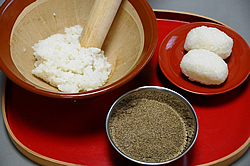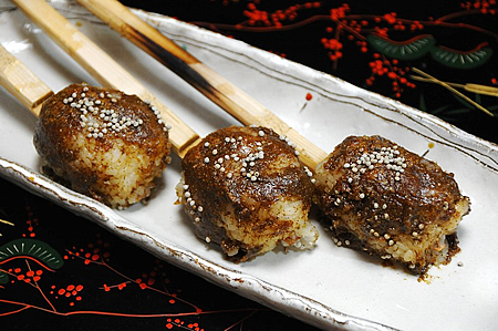 - ご飯は半分潰して(半殺し)、Sサイズの卵大にまるめて串にさし、[2]の味噌をつけて囲炉裏で両面を焼く。