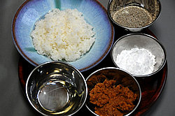 - えごまはフライパンで2、3粒はじけるまで中火で炒り、すぐにすり鉢でサラサラになるまで摺る。